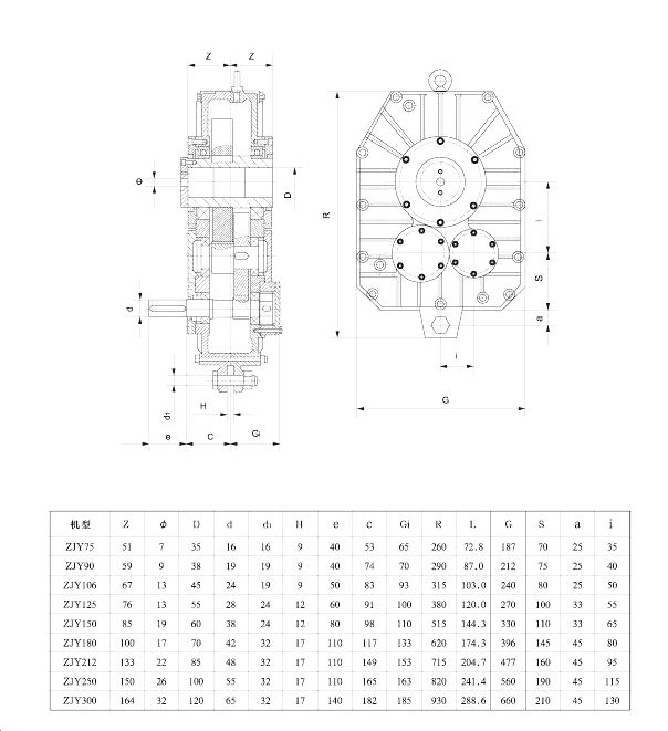 產(chǎn)品按ZBJl9009-88標(biāo)準(zhǔn)制造。主要傳動(dòng)零件采用優(yōu)質(zhì)合金鋼材質(zhì)。齒輪經(jīng)滲碳淬火磨齒工藝加工,精度為(GBl0095-88)6級(jí)。產(chǎn)品體積小,承載能力高,壽命長(zhǎng),噪音低,效率高。與ZJ系列軸裝和減速器比較,相同的輸出扭矩,ZJY重量只有ZJ的30%左右,因而對(duì)配套主機(jī)的機(jī)架剛性要求大大下降,傳動(dòng)平衡。