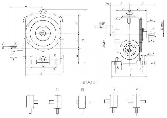 圓柱蝸桿減速器的外形、安裝尺寸及裝配形式 |
