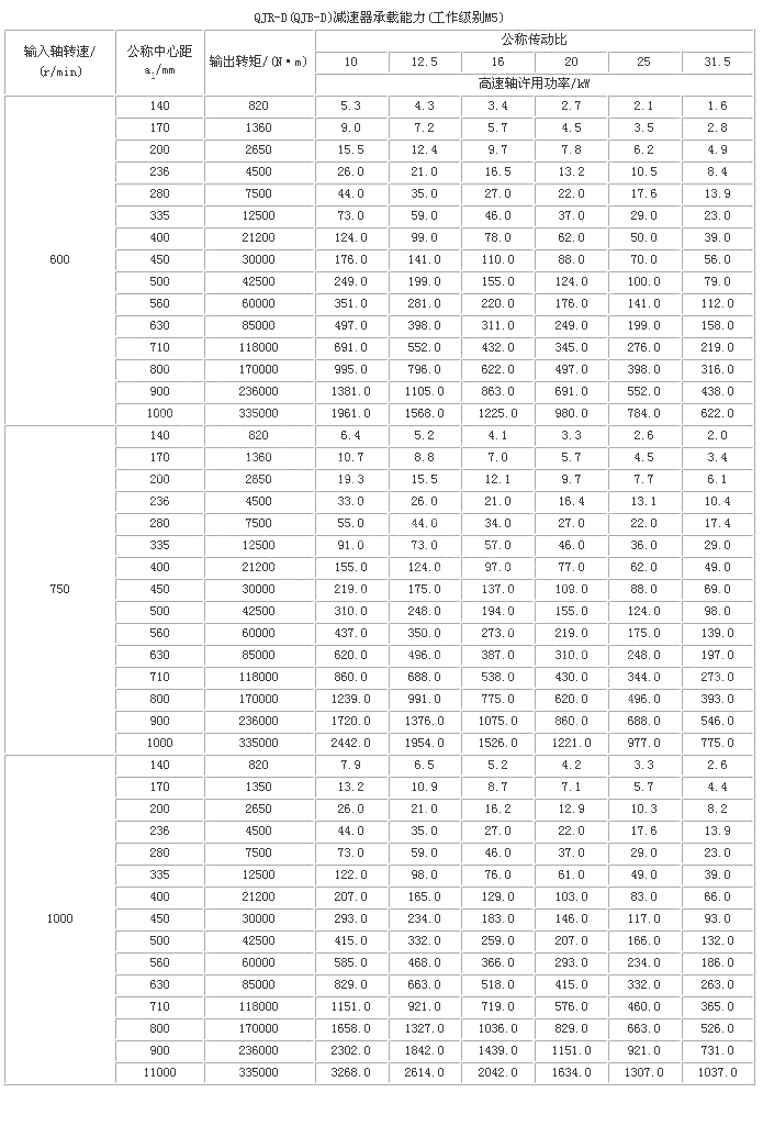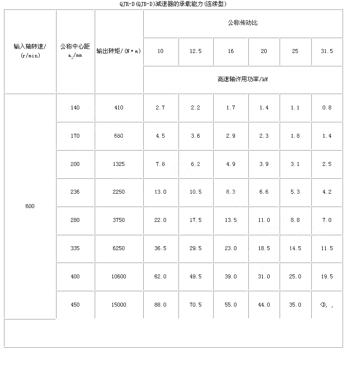 起重機底座式減速器是在三支點減速器的基礎(chǔ)上派生出來的。因此QJ-D型減速器的工作條件、主要技術(shù)參數(shù)、承載能力和輸出軸端最大允許徑向載荷與三支點減速器相同,其它有所不同。