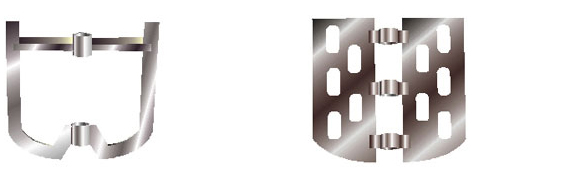 此類攪拌器為慢速型攪拌器,適用于中高粘度液體的混和、傳熱反應等過程。μ<105cP,轉速n=1-100rpm。錨框式(MKS)低速旋轉時沿壁面能得到大的剪切力,可防止沉降及壁面附著,底部形狀貼合橢圓形罐與中間的底軸承。錨帶式(MDS)是螺帶和框式的組合,結合了螺帶式和框式攪拌器的作用。方框式(FKS)、方柵式(FSS)形狀簡單制作容易,效能同框式,中等粘度的混合,深解更適合些。板框式(BKS)是另一種簡易的慢速攪拌器,板框上開的孔,其形狀數(shù)量,分布型式,都可以因需要而變化。