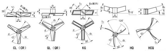 三葉后齒左旋式CL、三葉后齒右旋式CR、三葉后齒可拆左旋式CCL、三葉后齒可拆右旋式CCR、三葉翹曲左旋式QL、三葉翹曲右旋式QR、三葉翹曲可拆左旋式QCL、三葉翹曲可折右旋式QCR、三框刮板式KG、三葉后掠整體式HQ、三葉后掠可拆式HCQ