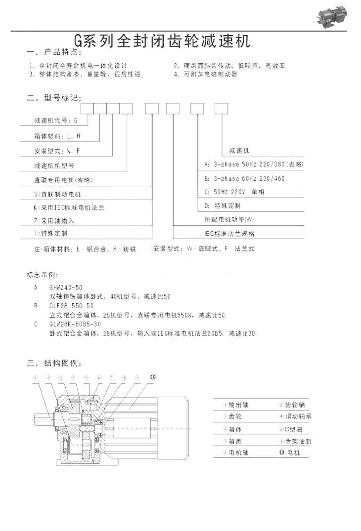 | G系列全封閉齒輪減速機(jī)產(chǎn)品特點型號標(biāo)記結(jié)構(gòu)圖例 |